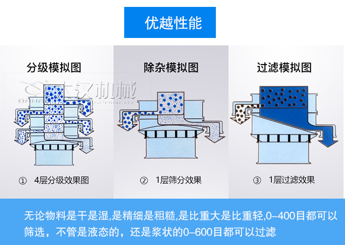 我們的不銹鋼旋振篩采用"強力"新型動力激振器,三維動力更加突出,無論物料是干是濕,是精細是粗糙,是比重大是比重輕,0-400目都可以篩選,不管是液態的,還是漿狀的0-600目都可以過濾,旋振篩系列產品同時配備專門的篩網清理裝置,把堵網率降到低,我們還可根據客戶需求設計特殊型號,讓用戶有更多的選擇。