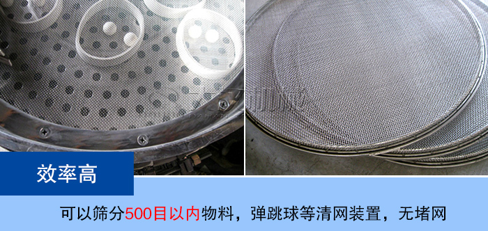 雙層旋振篩可以篩分500目以內粉狀及顆粒狀物料,也可過濾5微米的漿液物料,篩分除雜效果好,,每小時可以處理1-5噸左右的物料,另外,我們的雙層旋振篩還加裝了彈跳球等清網裝置,設備無明顯的堵網現象,篩分效率高。