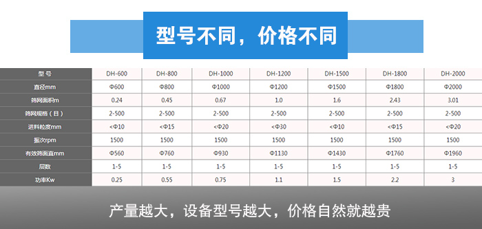 用戶對于面粉篩分產量的要求就決定這不銹鋼旋振篩的價格,而篩分面粉的不銹鋼旋振篩型號有DH400、DH600、DH800、DH1000、DH1200、DH1500、DH1800、DH2000等,不同型號的不銹鋼旋振篩對應的產量是不同的,如果面粉的產量在500kg/h及以下就可以選擇DH400、DH600不銹鋼旋振篩,每小時產量在500-1200kg之間需要選擇DH800、DH1000、DH1200等型號,產量越大,設備型號越大,價格自然就越貴。