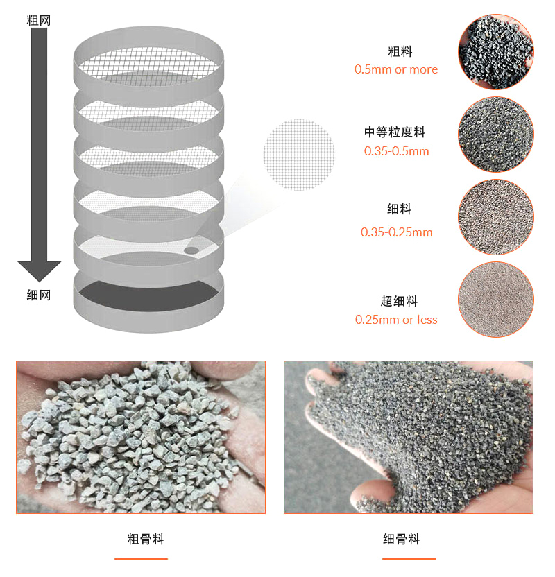 粒度分級(jí):根據(jù)篩孔或篩網(wǎng)的大小,物料會(huì)被分為不同的粒度級(jí)別。較細(xì)的顆粒會(huì)通過較小的篩孔,而較粗的顆粒會(huì)被擋在較大的篩孔上。