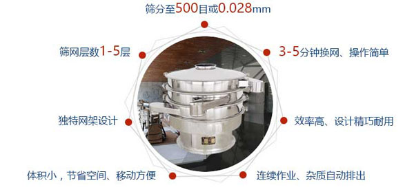 3、篩網不阻塞、粉末不飛揚、篩分細可達500目(28微米)過濾細可達5微米。