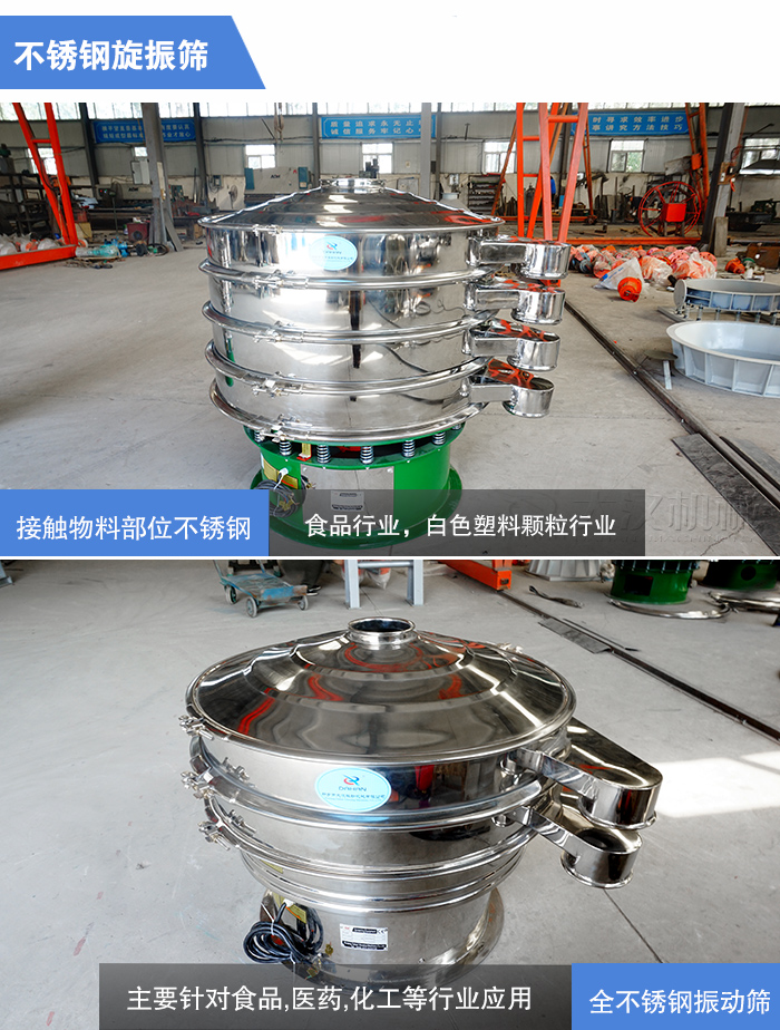 不銹鋼旋振篩的材質(zhì)樣式分為接觸物料部位為不銹鋼和全不銹鋼振動(dòng)篩兩種。接觸物料為不銹鋼材質(zhì)的振動(dòng)篩主要是物料對(duì)接觸的設(shè)備材質(zhì)有所要求,防止物料與碳鋼接觸對(duì)物料進(jìn)行污染,特別是食品行業(yè),白色塑料顆粒行業(yè)等。全不銹鋼振動(dòng)篩是主要針對(duì)食品,醫(yī)藥,化工等行業(yè)應(yīng)用,其使用環(huán)境要求嚴(yán)格,容易對(duì)設(shè)備進(jìn)行清理。