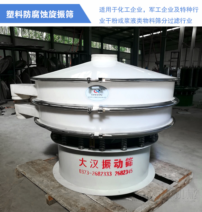 塑料防腐振動(dòng)篩主要是為了解決篩分時(shí)特殊物料與金屬接觸而產(chǎn)生化學(xué)反應(yīng)及腐蝕性較強(qiáng)等問題。振動(dòng)篩接觸物料部位從篩框、篩網(wǎng)、中框、密封蓋和清網(wǎng)裝置等完全采用非金屬材料,完全排除了一些特殊物料與金屬接觸會(huì)產(chǎn)生化學(xué)反應(yīng)等問題。本機(jī)適用于化工企業(yè),軍工企業(yè)及特種行業(yè)干粉或漿液類物料篩分過濾行業(yè)。
