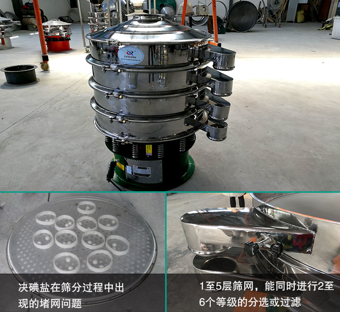 不銹鋼振動篩內部裝配有彈跳球清網裝置,可以有效解決碘鹽在篩分過程中出現的堵網問題,提高了篩機的篩分效率。此外,不銹鋼振動篩可篩1至5層篩網,能同時進行2至6個等級的分選或過濾,篩分更加高效。 干凈衛生